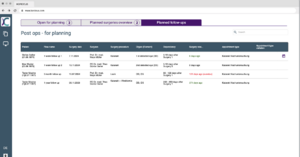 - Post Ops Table: Lists details of each planned postoperative follow-up, including patient information, follow-up flow name, surgery date, surgeon, procedure, organ, dependency, follow-up timing, and appointment type.