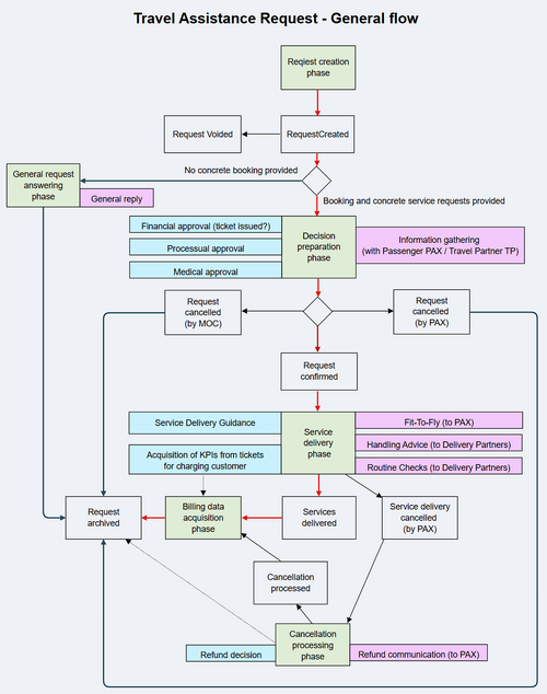 - Request creation phase - the PAX or the travel agent collects all information on his side on a travel assistance service request before submitting it. As third alternative, the operation center enters the request manually after receiving a request over an insecure channel, like email. At the end of this phase, there exists a valid travel assistance service request case